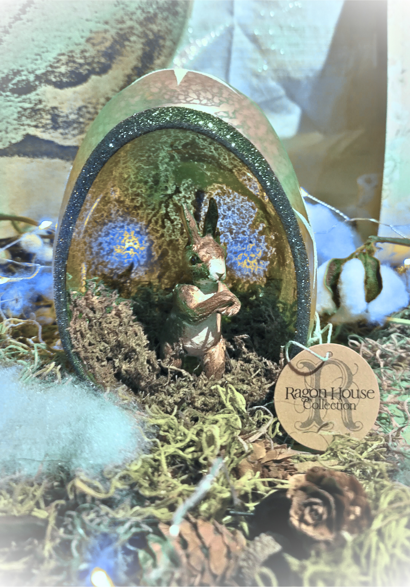 This is a rare Mercury Easter Egg Bunny with a carrot. The outside is a beautifully detailed nesting egg with a painted green glittered border. The inside is filled with moss from momma bears woodland realm. The rabbit inside is holding a little carrots stick as he hides inside the egg. A rare and retired vintage piece to add to your spring collection. 7 high x 4.5 wide.
