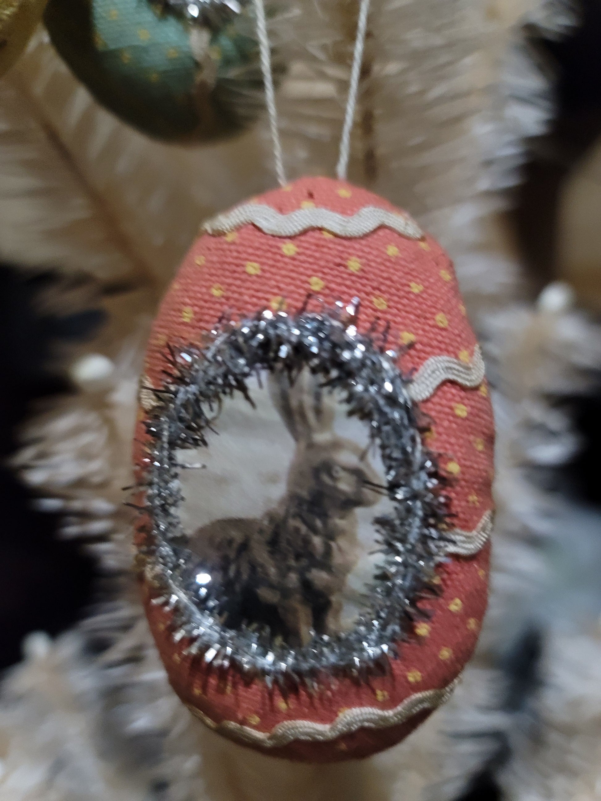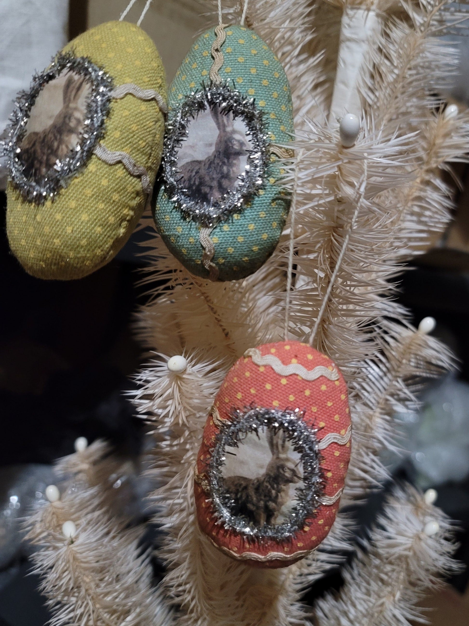 This is a primitive set of three cloth easter ornaments. The center has pictures of adorable bunnies. These are encircled by a blitter tinseled border. 3 x 2. There is a string for hanging. These would look wonderful on your spring prim tree for the Easter holiday season.