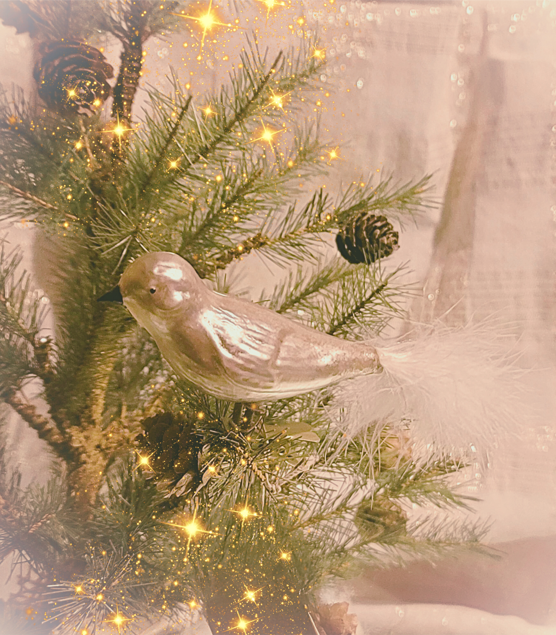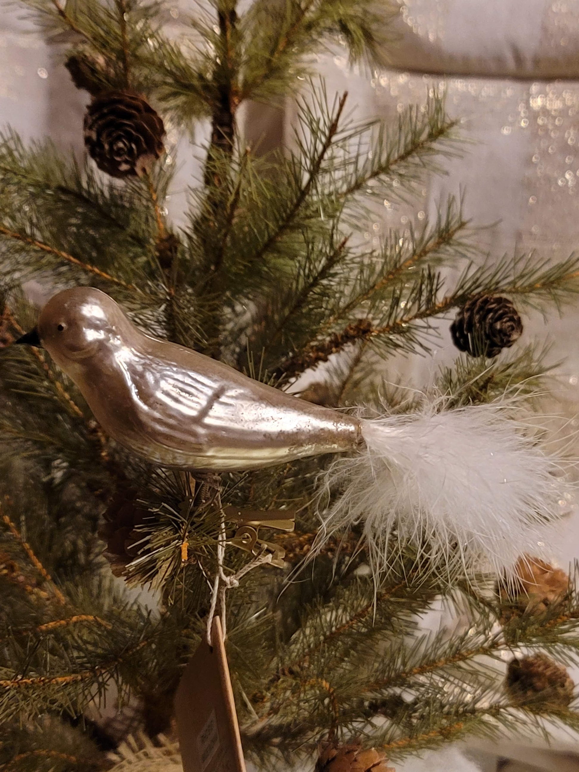 This beautiful german style clip bird ornament is made after the old style mercury glass german orns of old. She just flew in from the woodland realm and landed in this tree. Not only would she look splendid for Christmas but also for any time of the year on a prim tree anywhere your home. she is 1.5 high x 5 long.