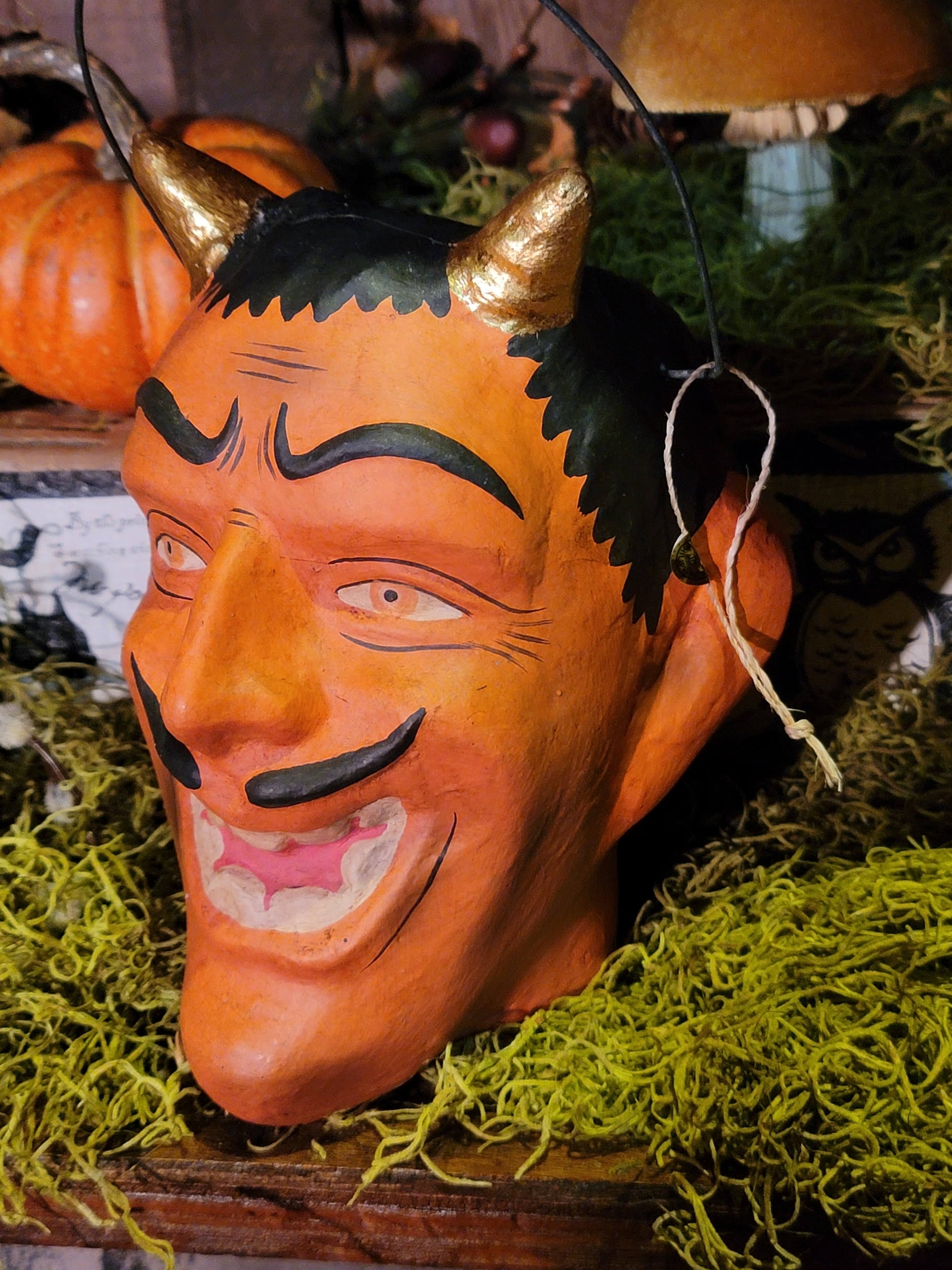Vintage Halloweeen Style Tharnwyck Devil Head Golden Horns Paper Mache Candy Bucket