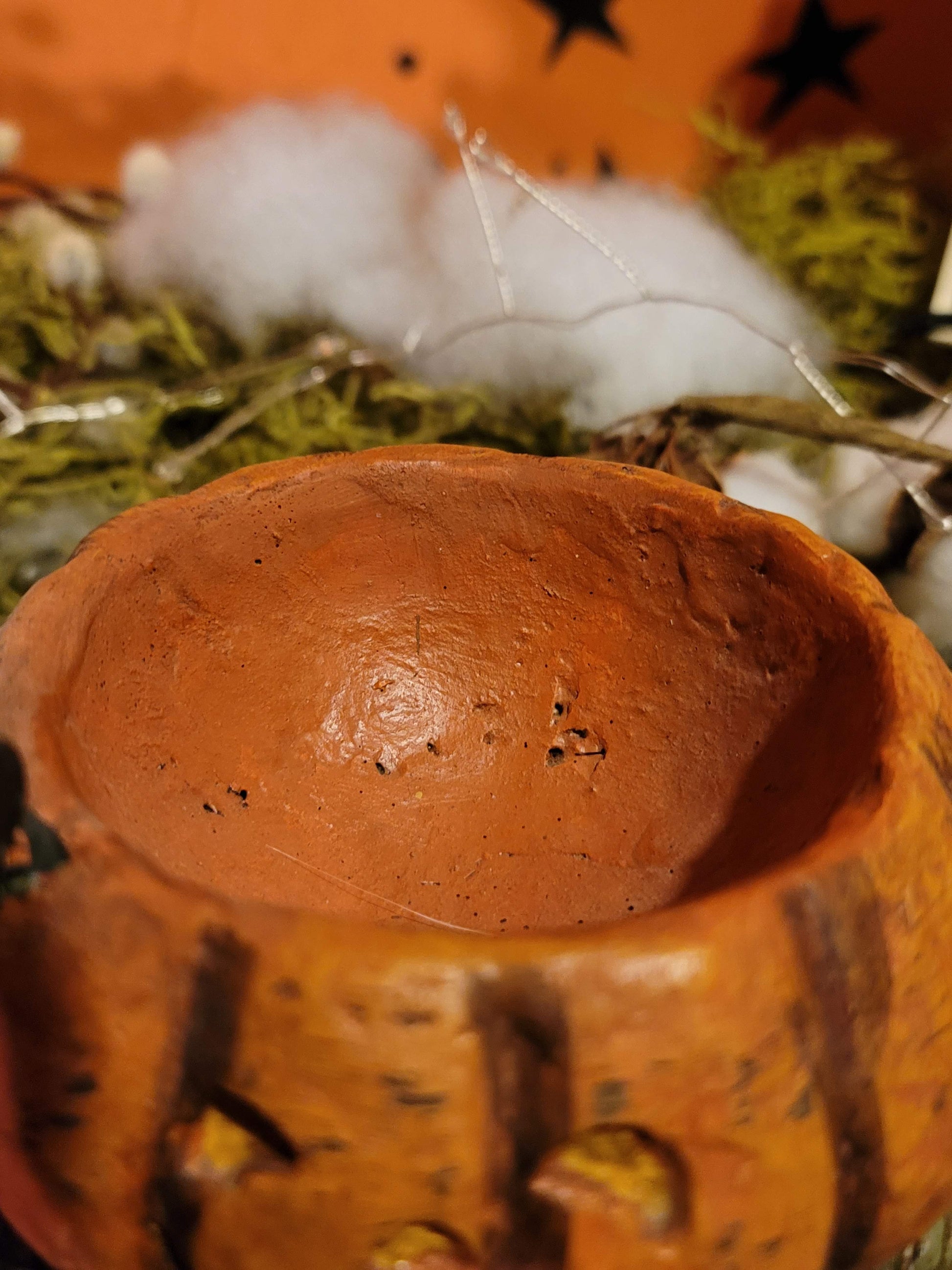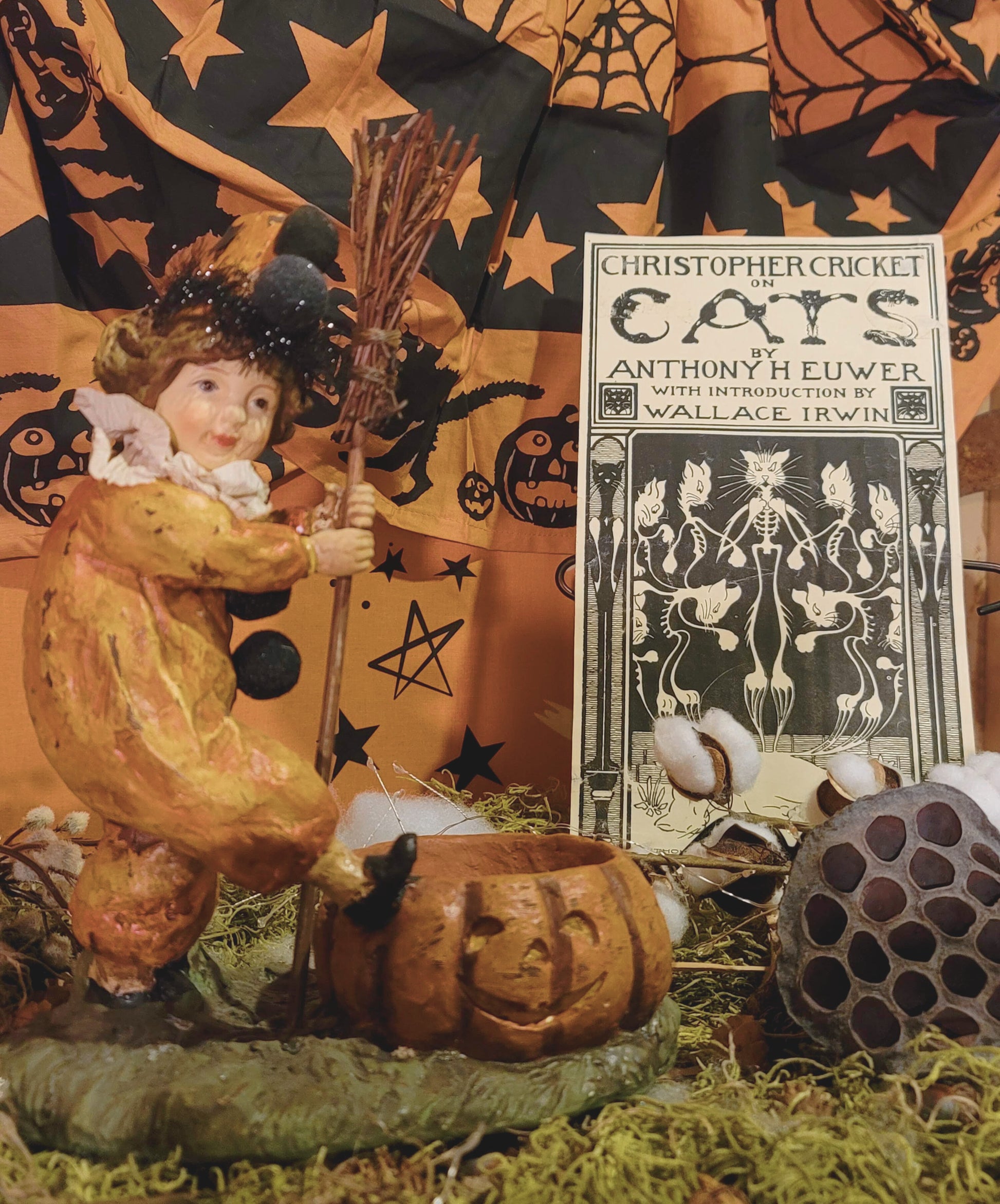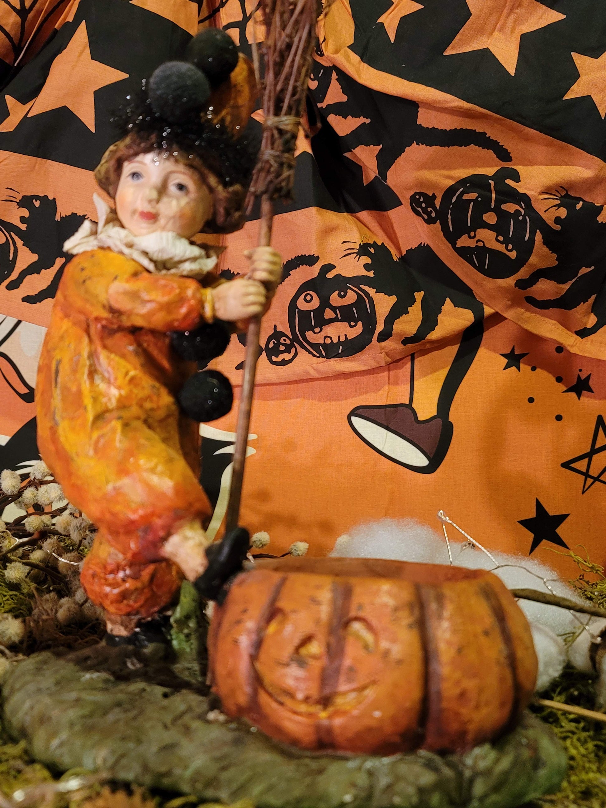 This is taken from an old Halloween Postcard. The trick or Treater clown girl appears as a Clapsaddle figurine and has an open pumpkin container. Another of Momma Bears heirloom attic pieces. This one has tinsel and a small bat upon her hat as well as balls on the front and not the side of her hat. A gorgeous piece. She measures 10.25 x 8 x 6. Distressed.