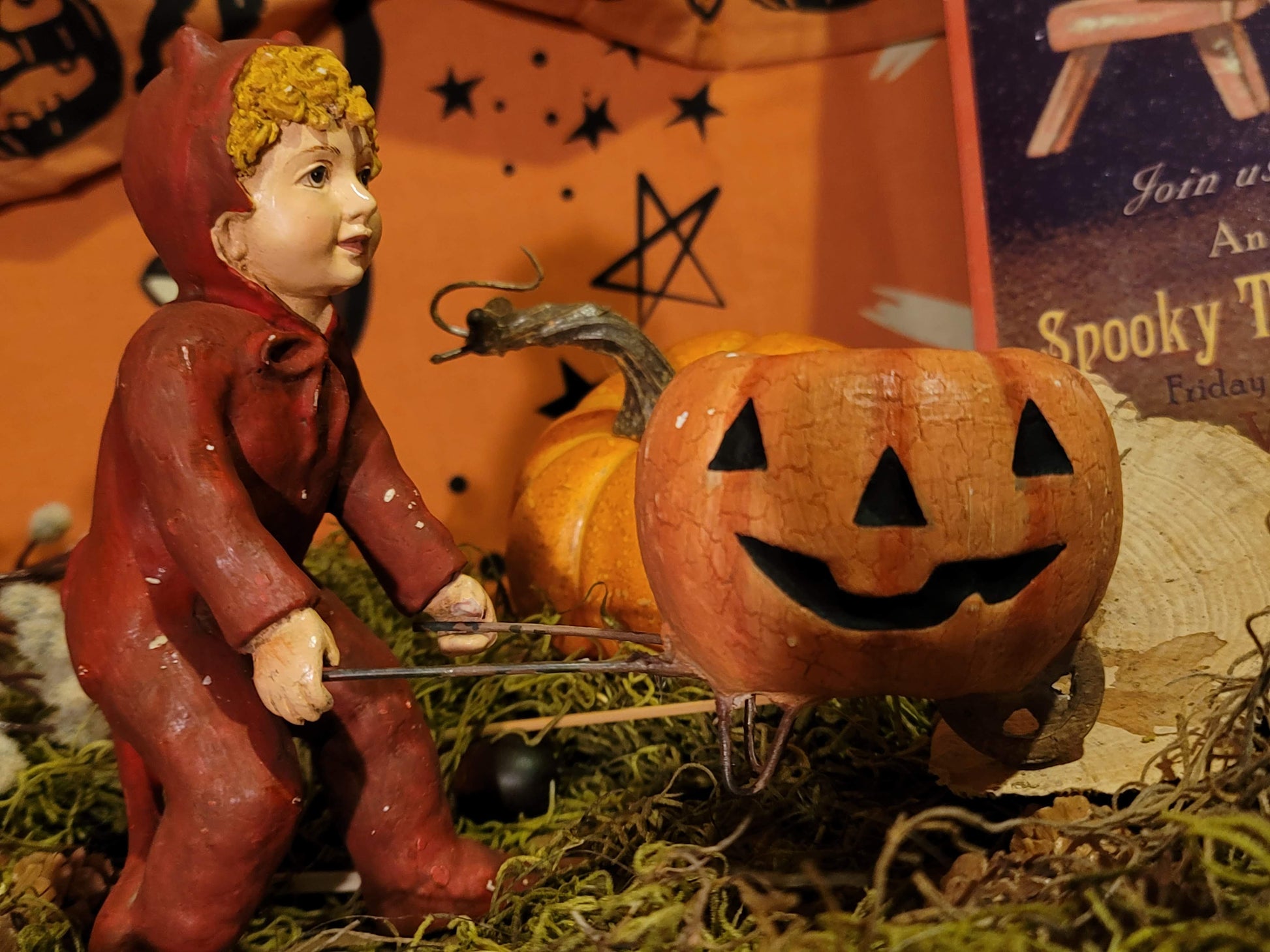 Vintage Halloween Style Bethany Lowe Devil Boy with Pumpkin Cart