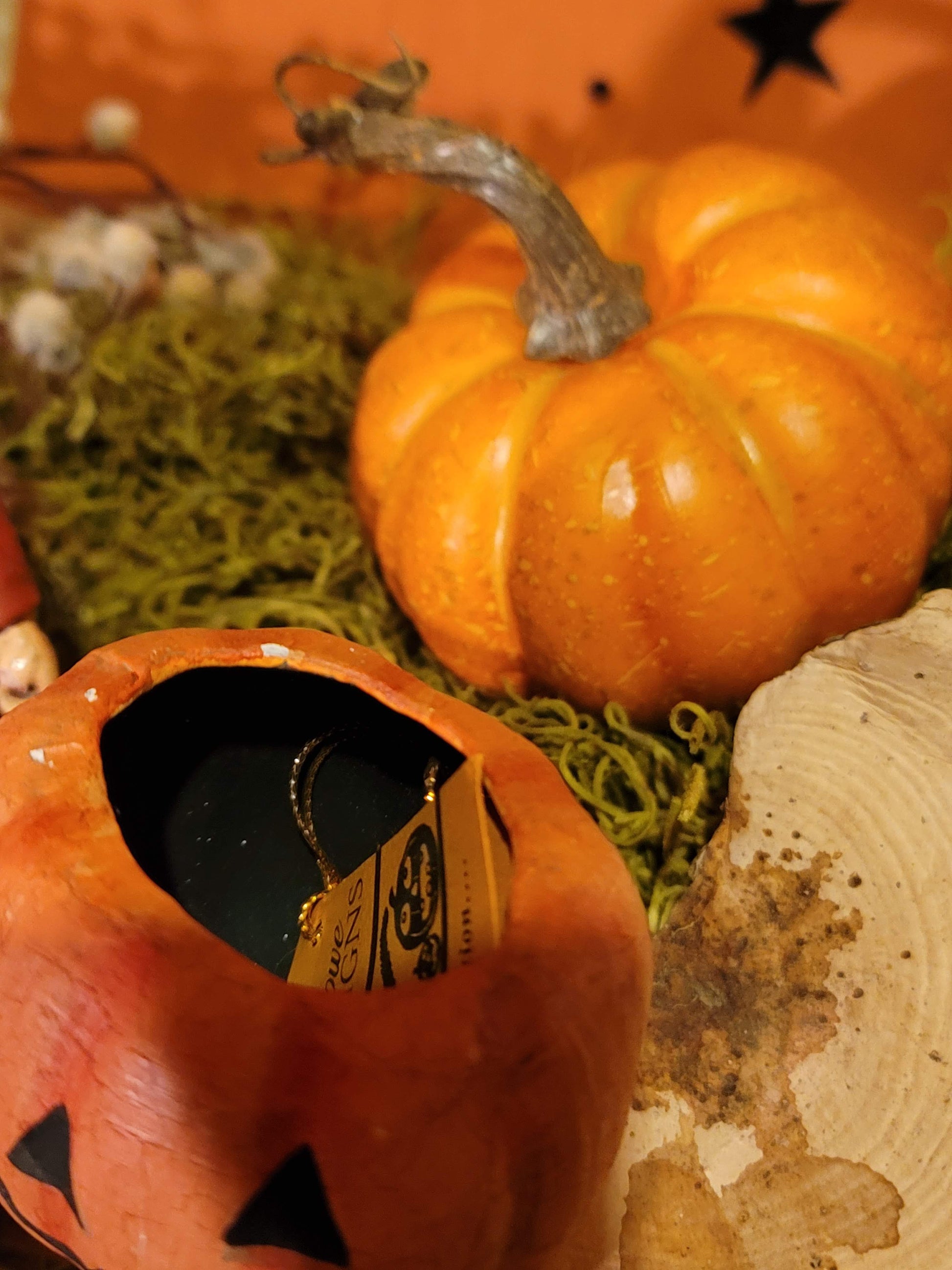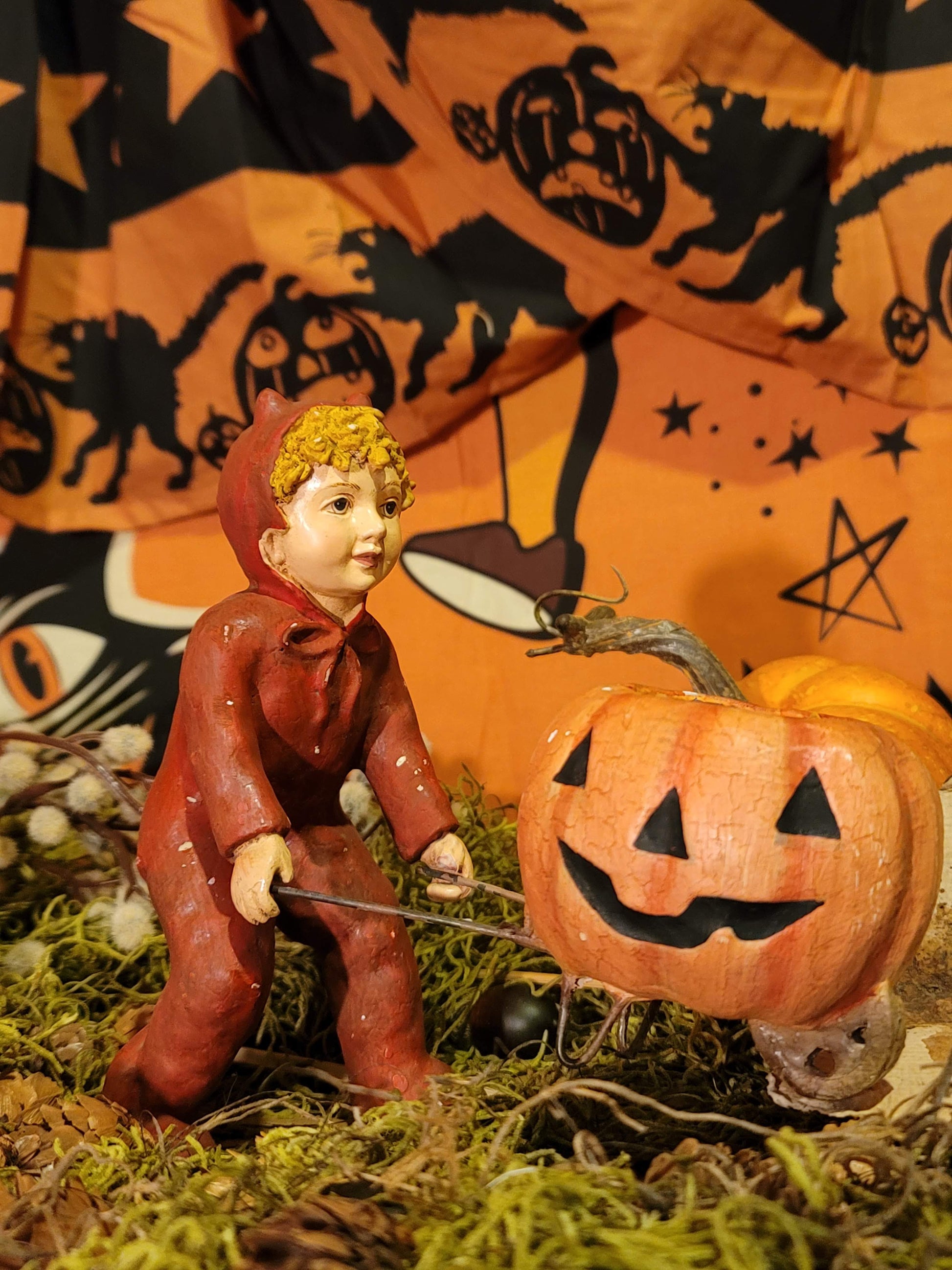 This is a RARE heirloom from momma bears antique attic. This is a halloween devil Boy with his little Pumpkin cart. The cart is for storing small treats inside. paper mache with wire handles for the cart. Incredible find for the Bethany Lowe collector. The cart does detach if needed. An amazing treasure! Picture this piece on your fall mantal or table among some leaves. He measures 6 x 9.