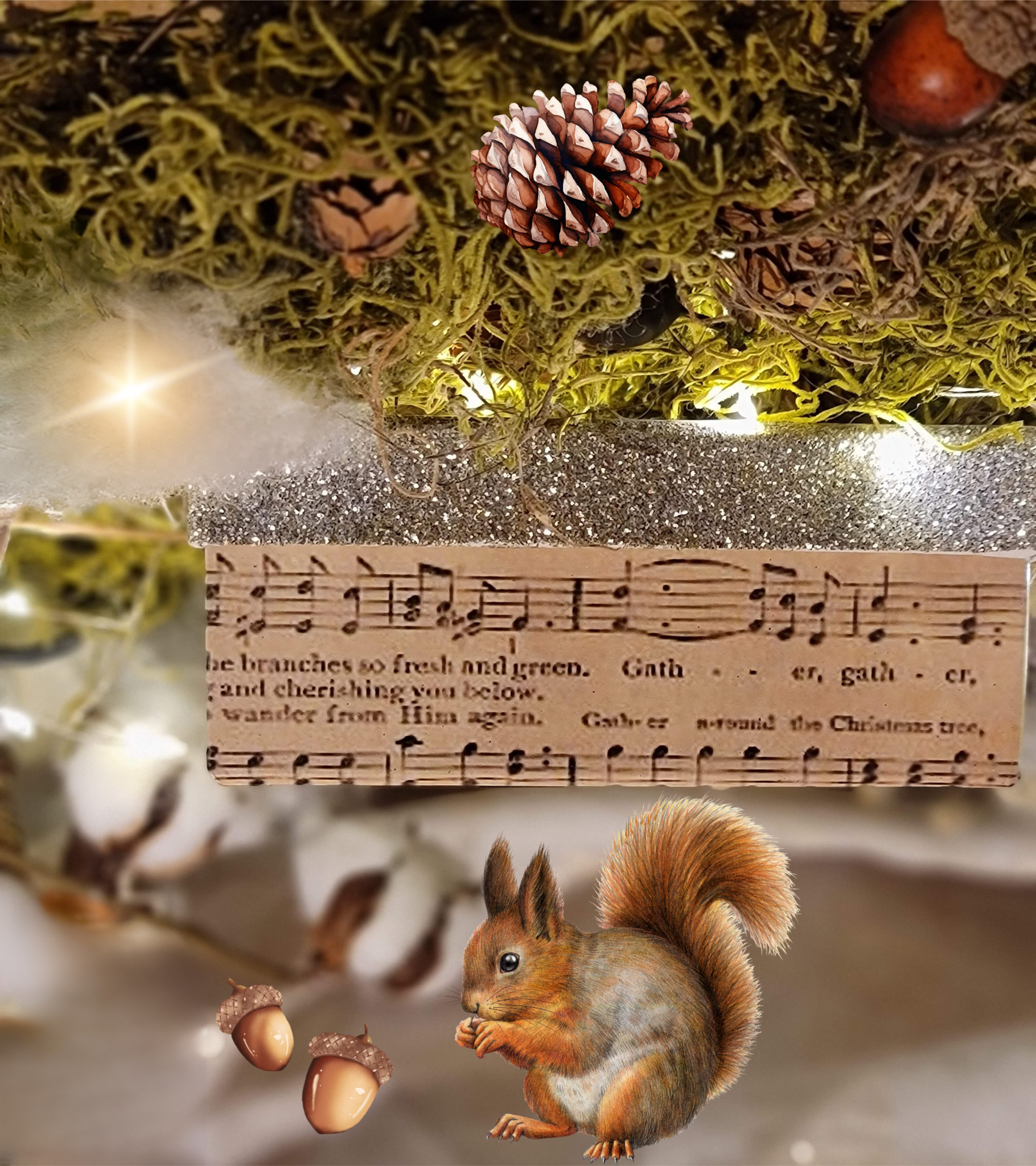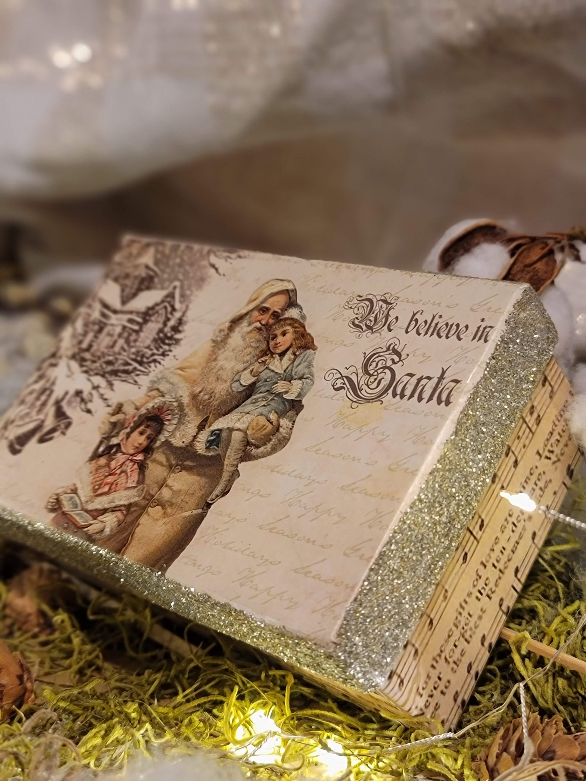 This is a santa father christmas glittered box container. There are beautiful musical notes written on the sides of these. There are 2 different styles to choose from. The first is a santa with children and the second is a santa with a tree. These are a heavy cardboard and mache mix. The pictures depict scenes from old victorian postcards. Perfect for placing small treasures inside or for extra special gifts. Music lover in the family? What a unique box for gifting for the Christmas season! 4 high x 6 wide.