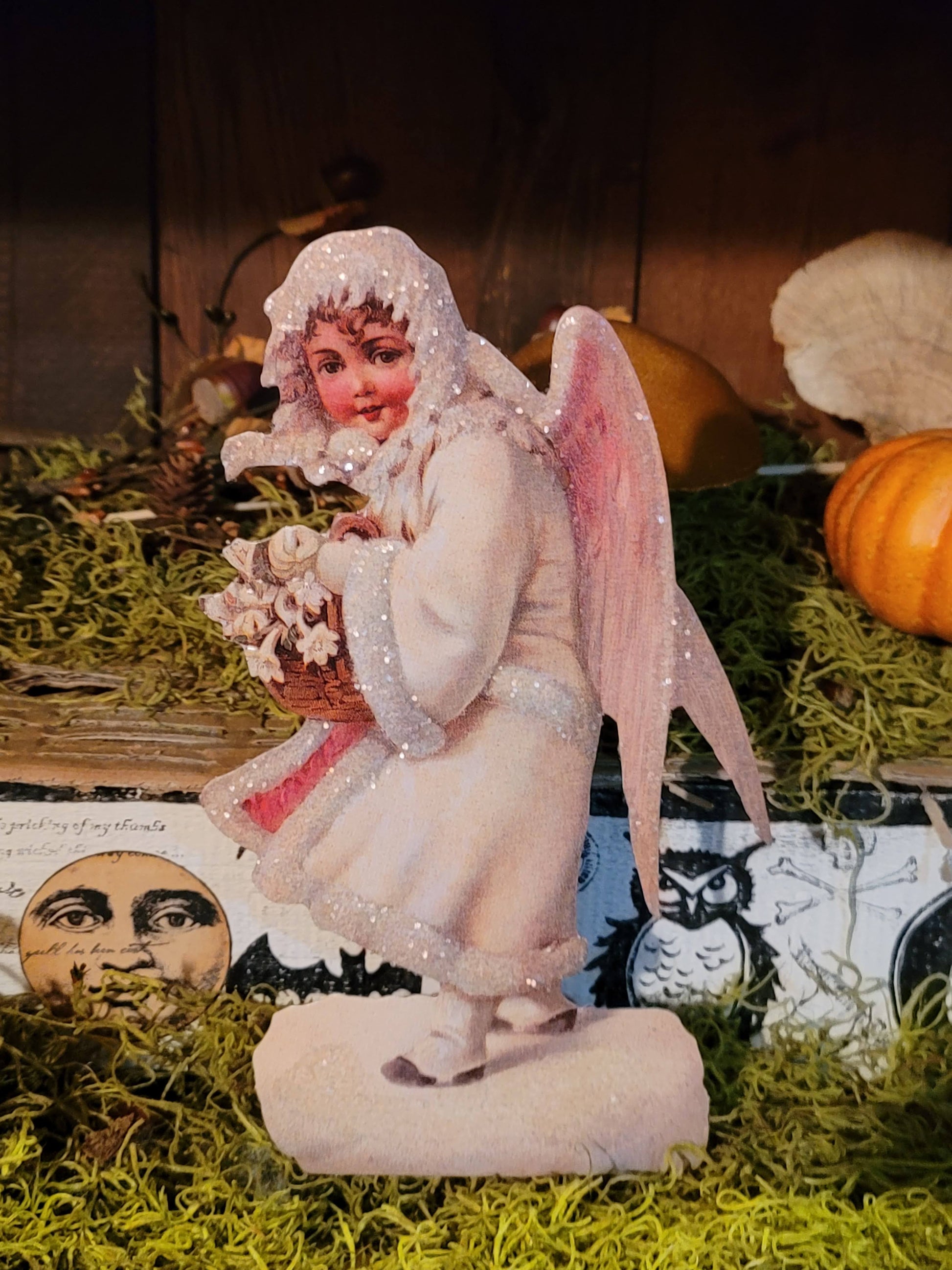 This angel is cloaked in shimmering white with a rosey cheeked grin. She cradles her flowers freshly picked from the realm. Pure vintage sweetness. Shes found walking baby bear to school many days and is adored by all the woodland creatures. Heavy cardstock and hand glittered. Perfect for sending or a decoration all season long.