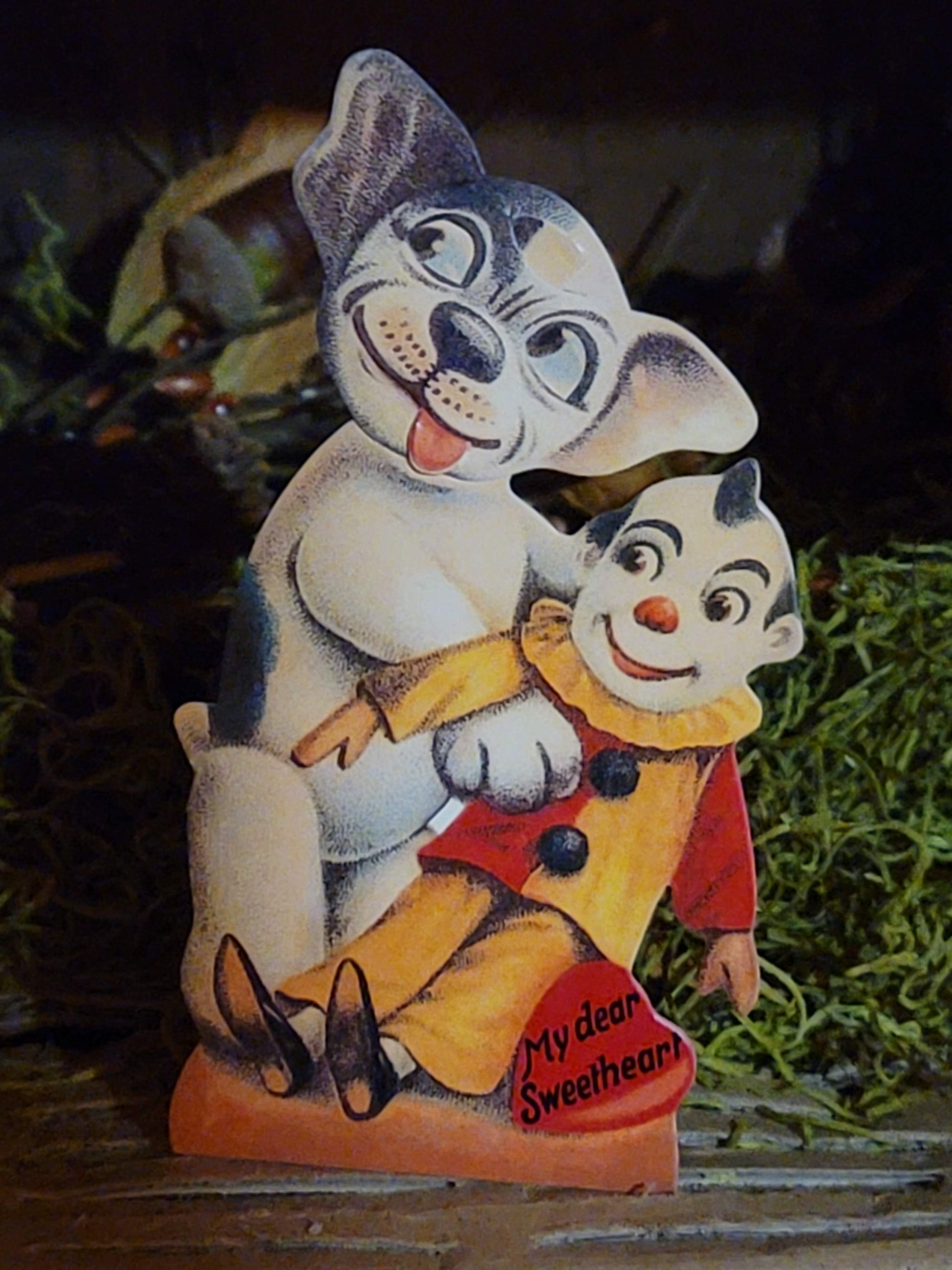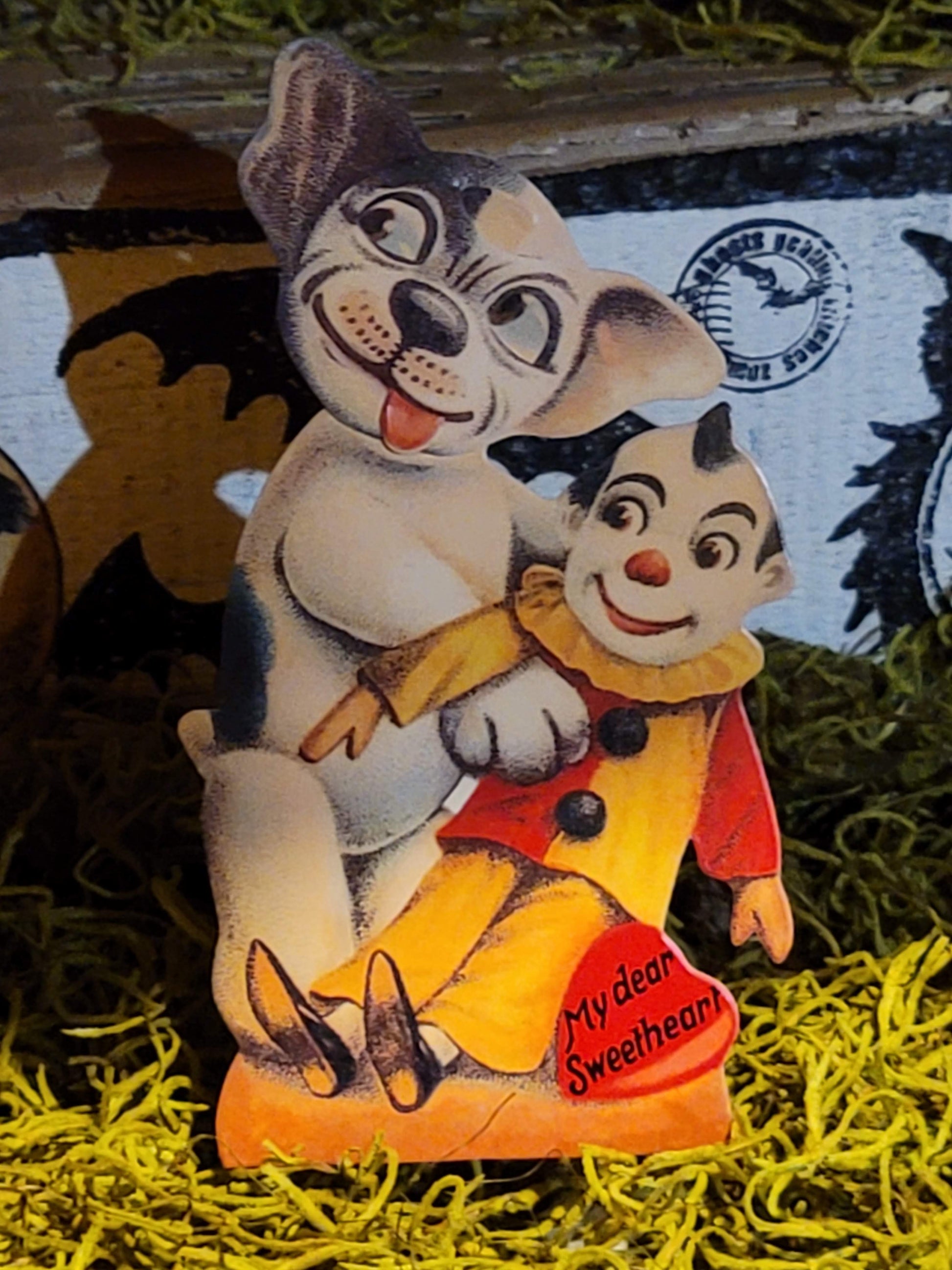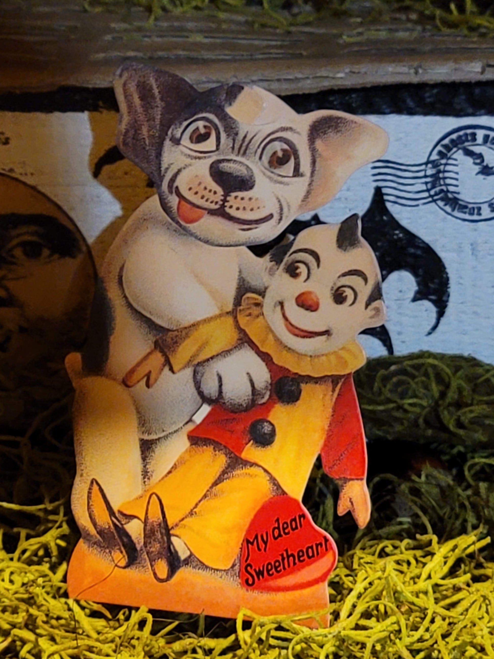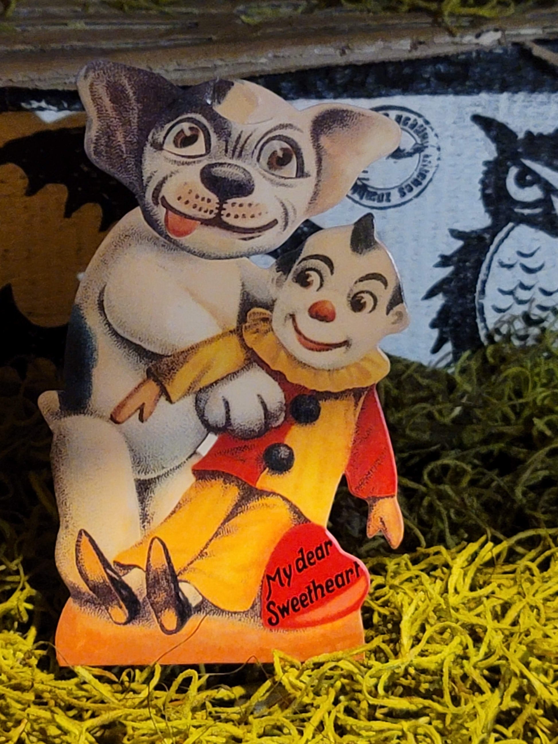 What a treasure. This is a wonderful moving eyes head and tounge mechanical card. These were taken from an old antique original. This is a gift not just for valentines but for any special someone or moment. A truly unique piece, Doggy is holding a clown and there is an easel on the back for standing.