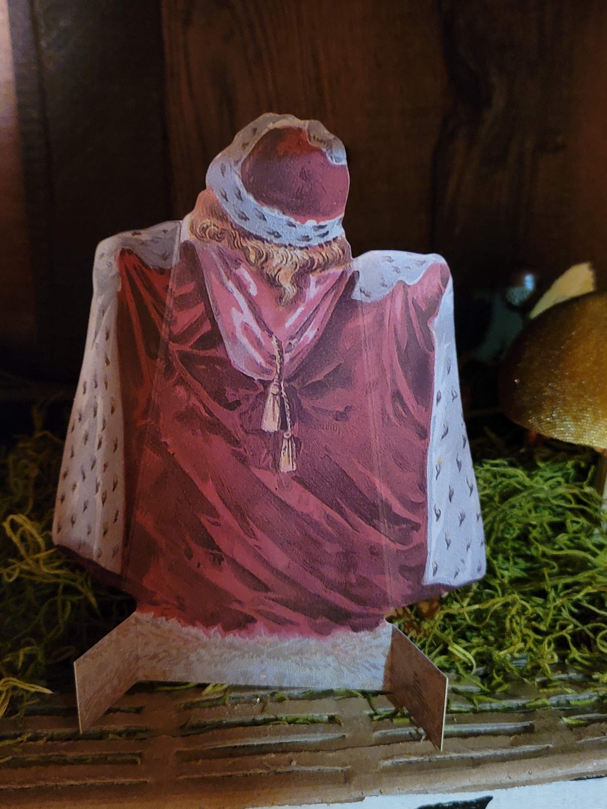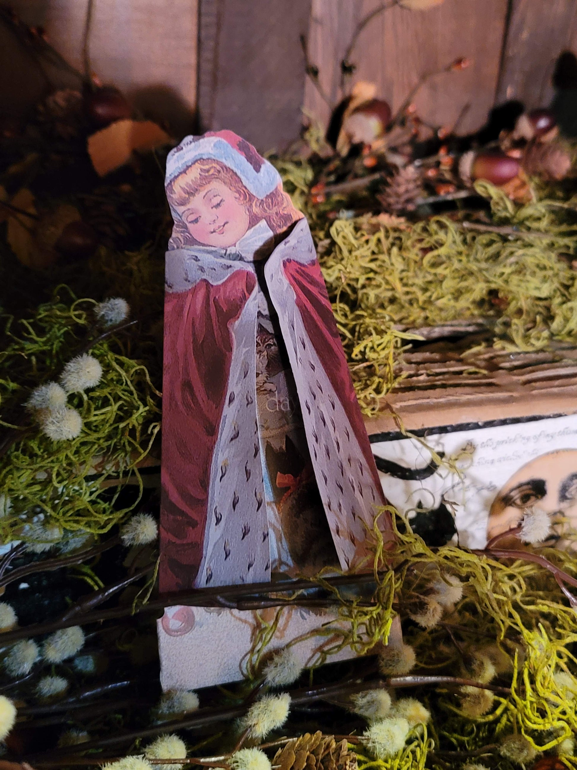 A whimsical Victorian-style easel card featuring a bonneted girl lifting her apron to reveal a surprise of kittens. With sweet humor and nostalgic flair, this standing card opens like a charming little “flasher,” sure to delight vintage lovers and woodland realm collectors alike.
