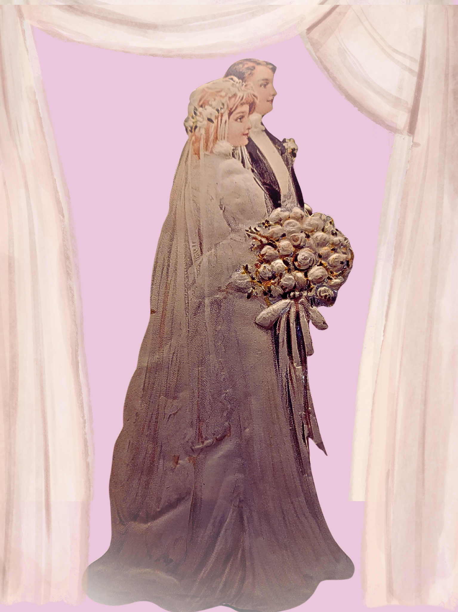 This exquisite easel-style card features a radient bride and groom, embossed and in timeless vintage style. They syand arm in arm as though they just stepped out of the pages of an heirloom photo. Embossed and die cut, this is a true heirloom treasure for that special couple.